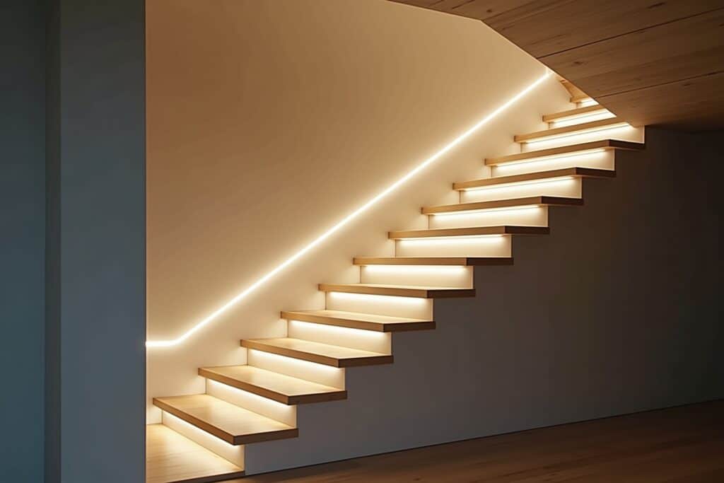 Dies ist eine der beliebtesten und effektivsten Methoden. Dabei werden LED-Streifen diskret unter der Vorderkante jeder Stufe angebracht, oft in einem Aluminiumprofil mit opaler Abdeckung. Das Licht strahlt sanft nach unten auf die darunterliegende Stufe und sorgt für eine blendfreie, gleichmäßige Ausleuchtung. Dies erhöht nicht nur die Sicherheit erheblich, indem es die Stufenkonturen klar definiert, sondern schafft auch eine schwebende Optik der Treppe. Achte auf eine Farbtemperatur im warmweißen Bereich (2.700K – 3.000K) für eine wohnliche Atmosphäre.