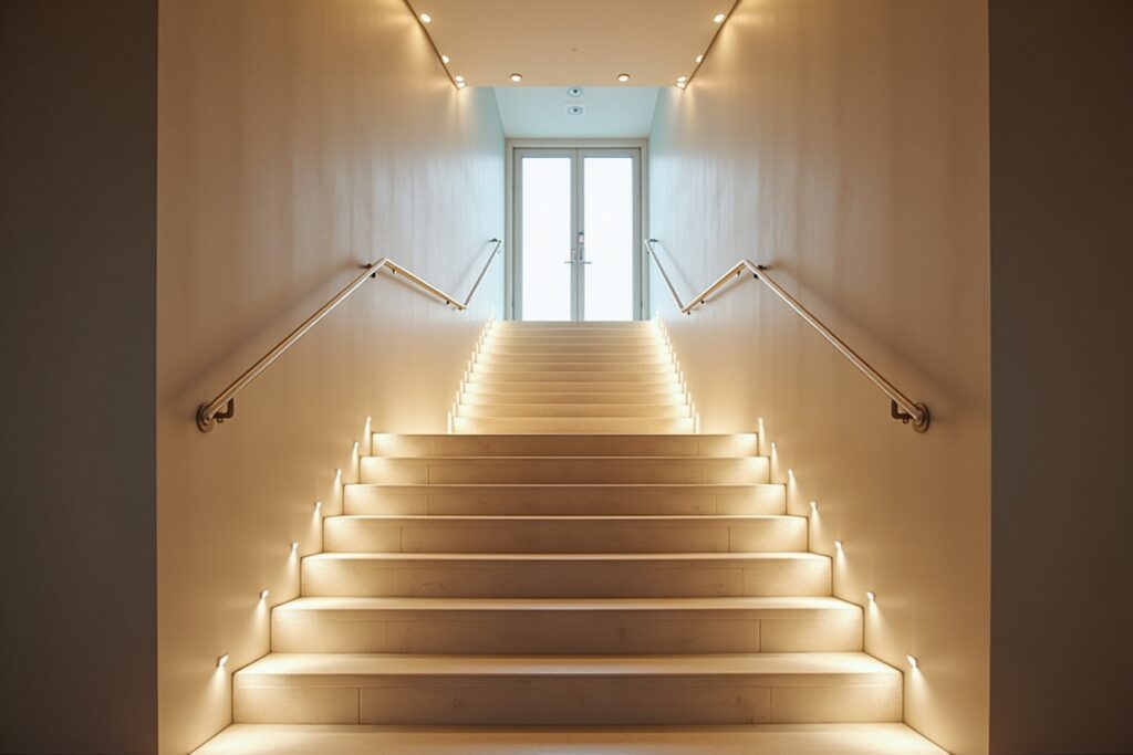 Obwohl keine reinen Wandleuchten, sind in die Stufen integrierte LED-Spots eine beliebte Ergänzung, die die Sicherheit am Boden erhöht. Sie können mit wandmontierten Leuchten kombiniert werden, um ein harmonisches Gesamtbild zu erzielen.